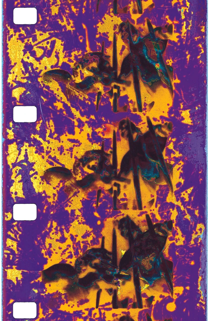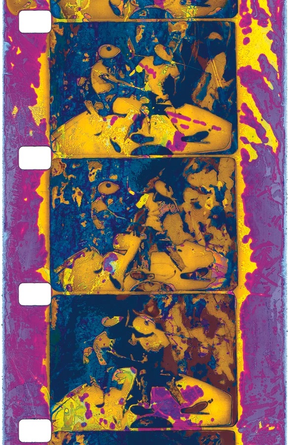 LB: This starts out as black and white film, which I reproduce on the optical printer using a high contrast black and white film, hand process it, often solarizing it and then I put it through 20 different steps of colorizing it by hand - bleaching and toning, bleaching and toning. Even that process, when I talk about it, when I get to near the last step - and I'm really controlling this - when I get to this last step, I need to consider what I want the dominant color to be. I throw the colorized film back into the developer and it goes back to black and white. Then all of the color is still there, but it's a latent image, a latent fact. Then I make my choice and I throw it into bleach and then throw it into what I want the dominant color to be and then it just explodes in color. Even within the process, this latent aspect really discovers that in part. It may not necessarily come off in the film, but it's all part of the process of interpretation, if you will.